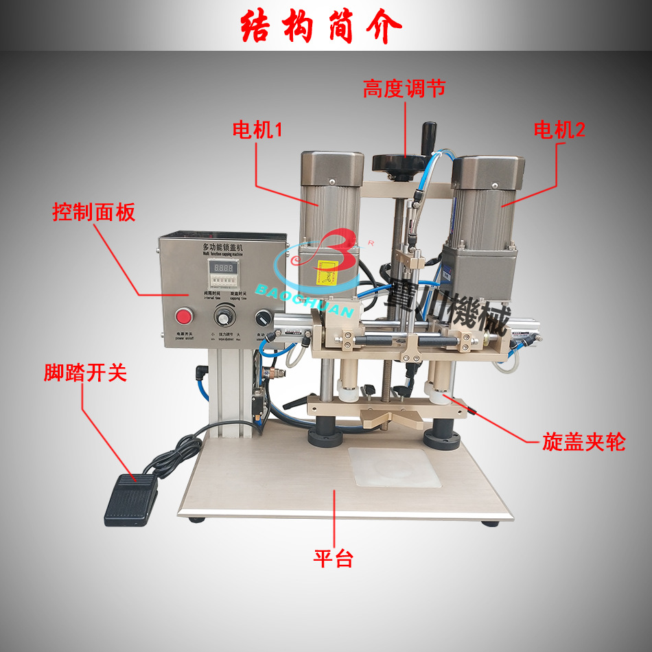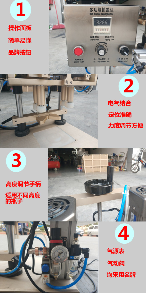 电压AC220V 50HZ功率900W尺寸55W*35L*61H[CM]净重约30KG使用气源0.4—0.6MPa锁盖范围16mm≤Φ≤50 mm锁瓶范围瓶高50-400mm 瓶宽20-100mm锁盖扭力标准值4--8kg/cm