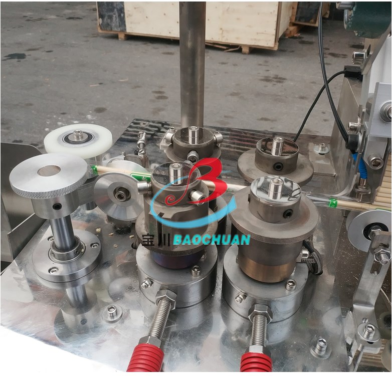 切断轮:新包筷子薄膜两头不匀,调整两切断轮,只要松开两轮上的紧定螺钉(M8内六角)可任意进行调整,但两轮必须刀对刀。